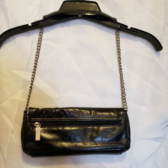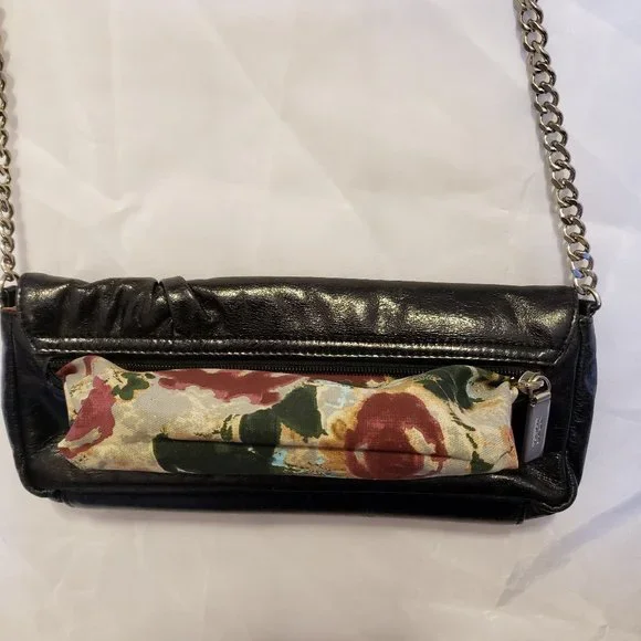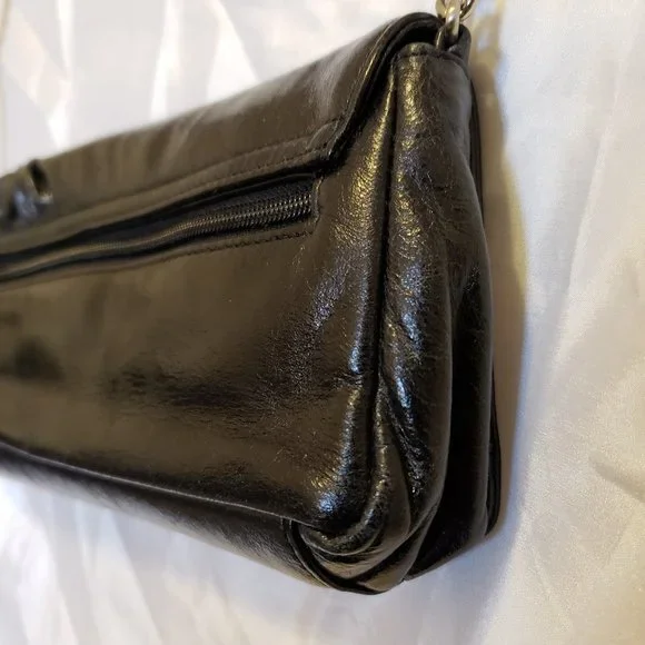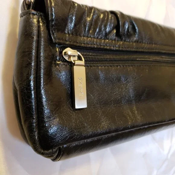 This aging gracefully oblong black beauty has a magnetic closure, ruched leather on left front side, 4 inside card slots and 4 compartments, one back zipper pocket, an attached...