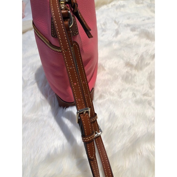 Dooney & Bourke pebble leather One inside zip pocket two inside pocket cell phone One with zipper inside hook Adjustable strap drop 26 in zip closure H 10 L 10 W4 Bobble gum color...