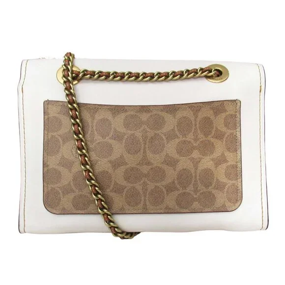 Brand: CoachColor: White & BrownDimensions: 10.25" W x 8" H x 4" D19" adjustable chain/leather strapExterior: Made of LeatherNo Closure (broken)Gold Toned Hardware1 Rear Zip...