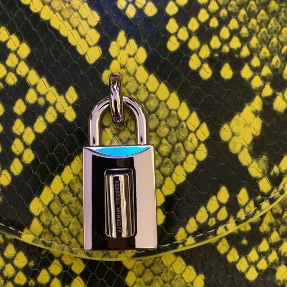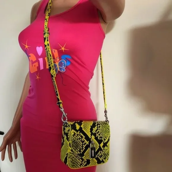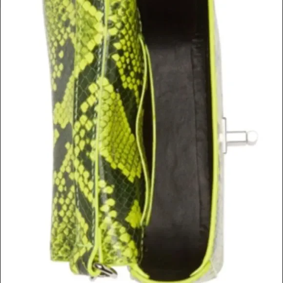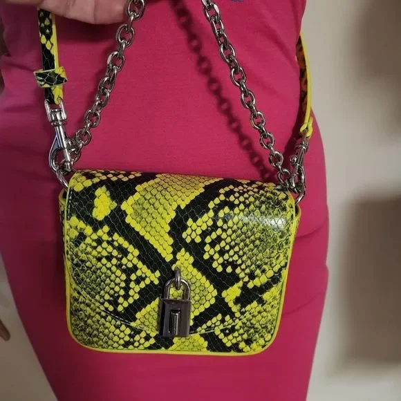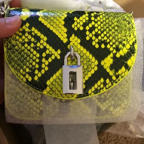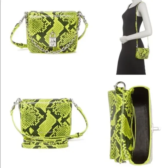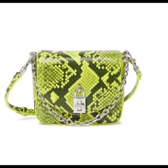 Leather and a key lock detail complete the look on this crossbody bag.Model´s height for scale: 5´9" - Detachable, adjustable shoulder strap - Turn-lock closure - Exterior features snakeskin embossed, chain detail and 1 back slip pocket - Interior features 4 card slots - Approx. 4" H x 6" W x 2.5" D - Approx. up to 22" strap drop - ImportedLeather exterior and interiorItem #6403461New without tagFits Iphone 8 ,keys and cashWith dust bag!