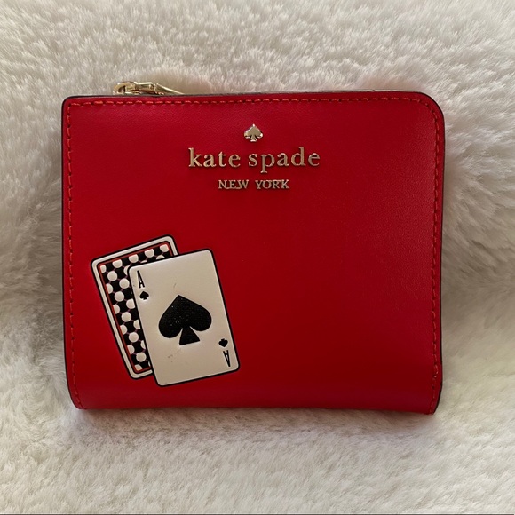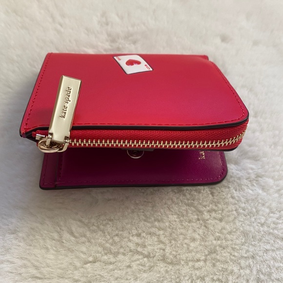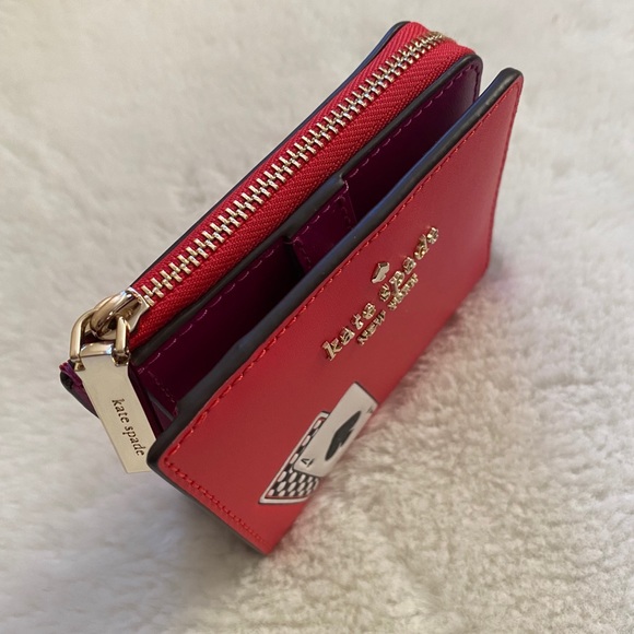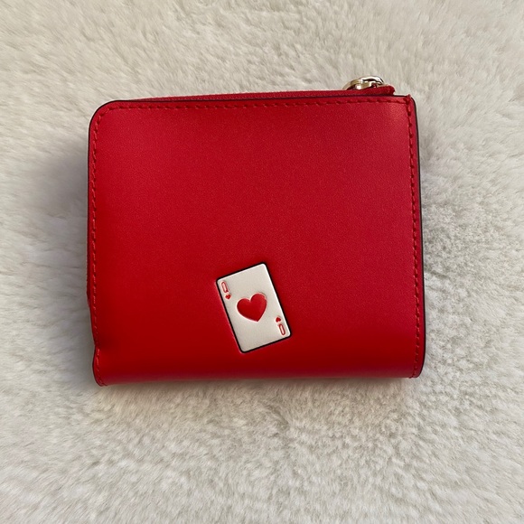 Small L-zip bifold wallet with lucky cards. Brand new with tags - red leather- credit card, I’d pockets- full bill pocket- side pockets- compartment with zip closure