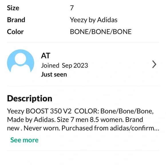 Yeezy BOOST 350 V2 COLOR: Bone/Bone/Bone. Made by Adidas. Size 7 in Men 8.5 Women’s. Brand New, Never Worn. Never opened the box. Purchased off adidas confirmed official Site/app August 10th 2023