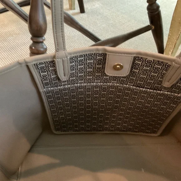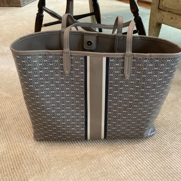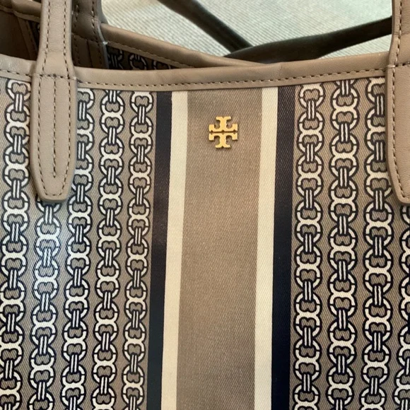 Classic Tory Burch bag made with coated canvas and leather trim. Magnetic snap closure. Large interior slip pocket. Taupe background with navy blue and cream chain link and stripe...