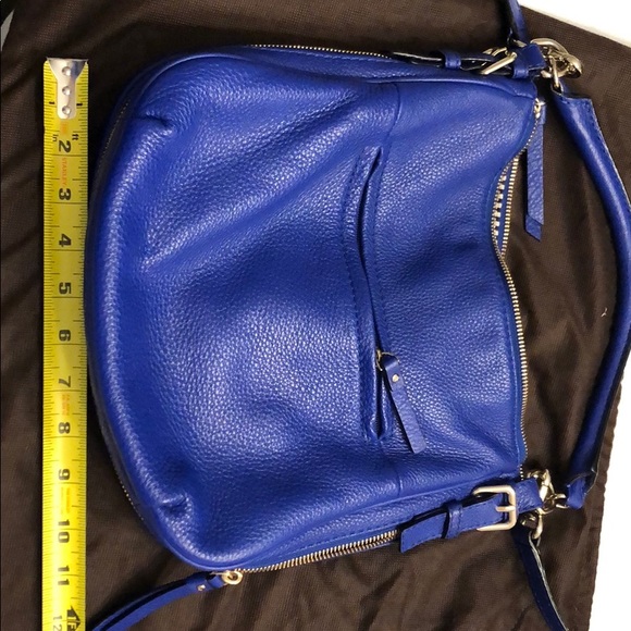 Kate Spade blue leather Cobble Hill Convertible Crossbody bagBlue with gold tone hardware exteriorBlack and white stripe print interiorZipper closureIncludes original dust bagExcellent condition- no stains or scuff marks - used very little