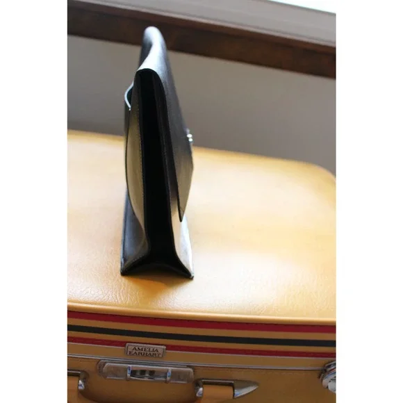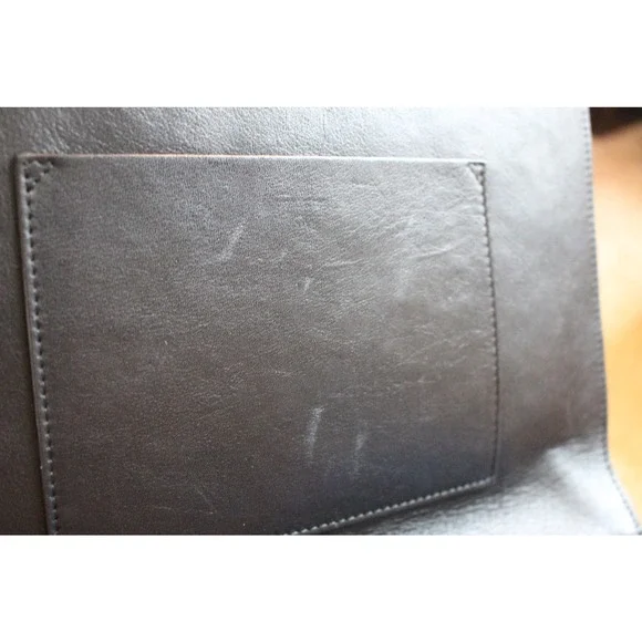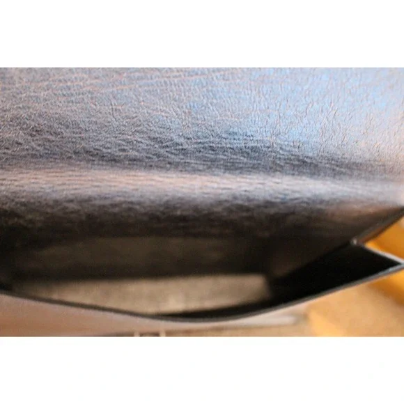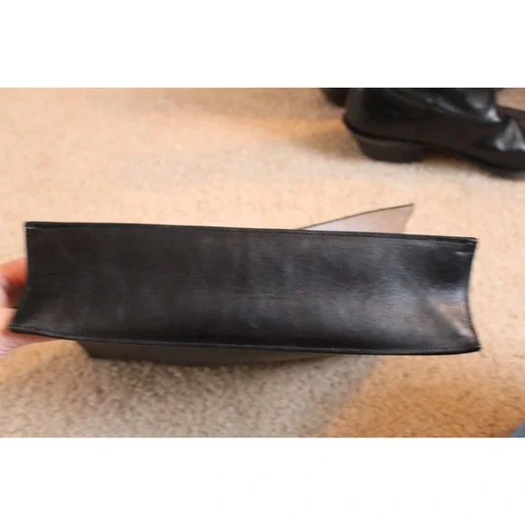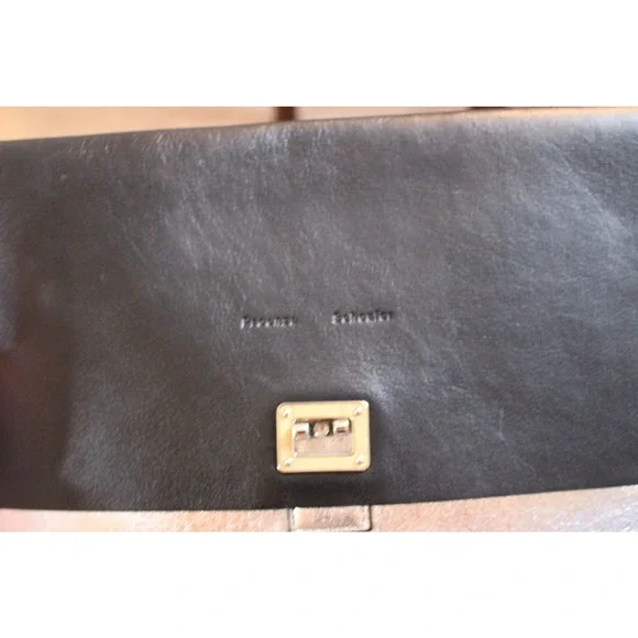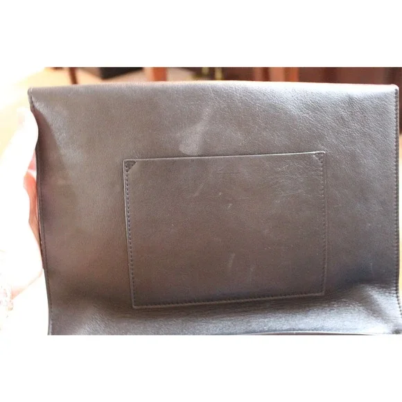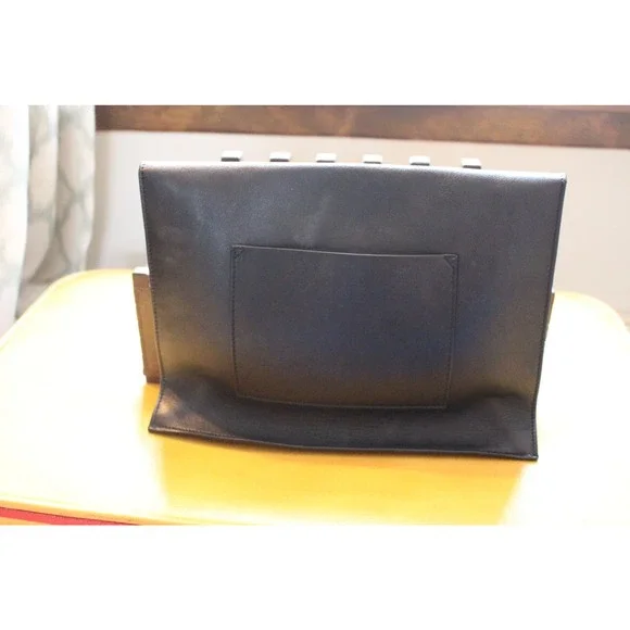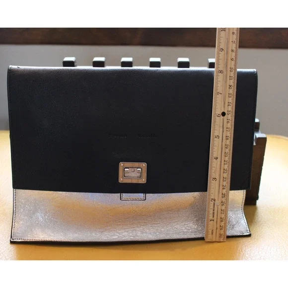 Please read in full before purchasing!This is an authentic, pre-owned piece. This item is in good condition, but does showsigns of wear( please see photos)This itemhas imperfections on the leather and the clasp closure hardware isMISSING.This is definitely repairable from a purse/ shoe repair shop or perhaps the designer ? The lowprice reflects all of the damage listed.This bag originally retailed at $1200.00Double Small Lunch Clutch in Black & Silver high quality leather with leather lining and silver-tone hardware.There is one exterior pocket.Approximate measurements: 10in long x 2in wide x 7in high