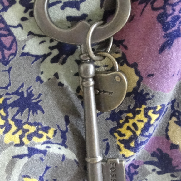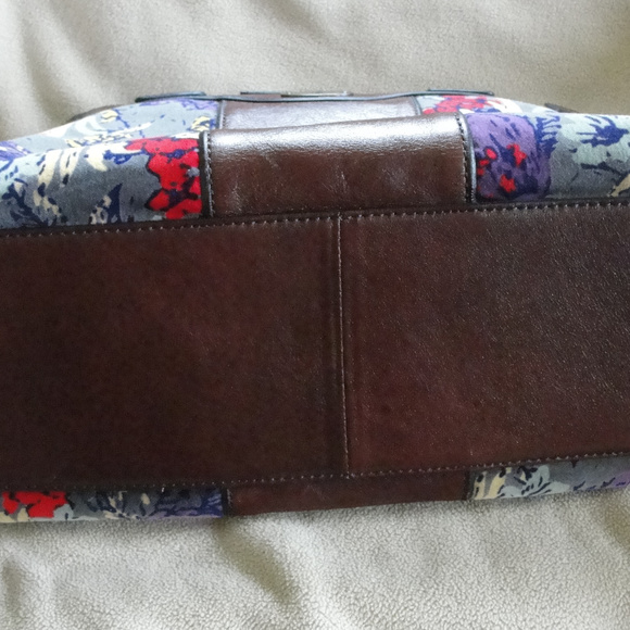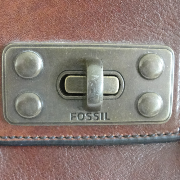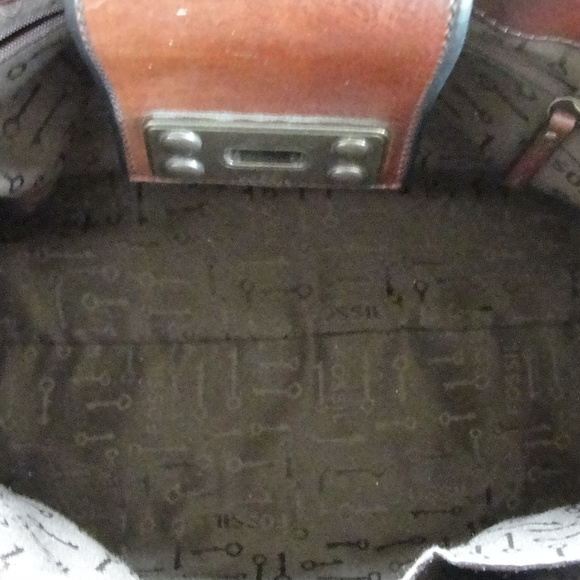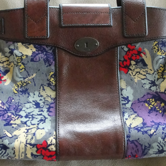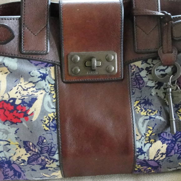 Exceptional pre-owned Fossil tote style hand bag.Nice brown leather with afloral faux suede/valour panel on each side of the brass turnkey over flap, and double handled.The interior is the signature fossil brown material with the fossil name and key.Two side pockets on one side and a zipper pouch on the other.Also the Fossil signature lock and key hang from one of the handles.Excellent pre owned condition. No rips or tears and only a couple of very minor (hardly noticeable) scuffs.