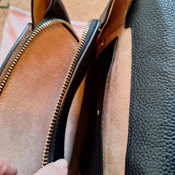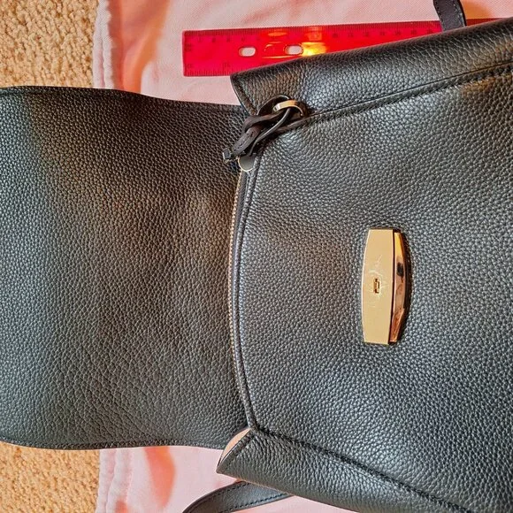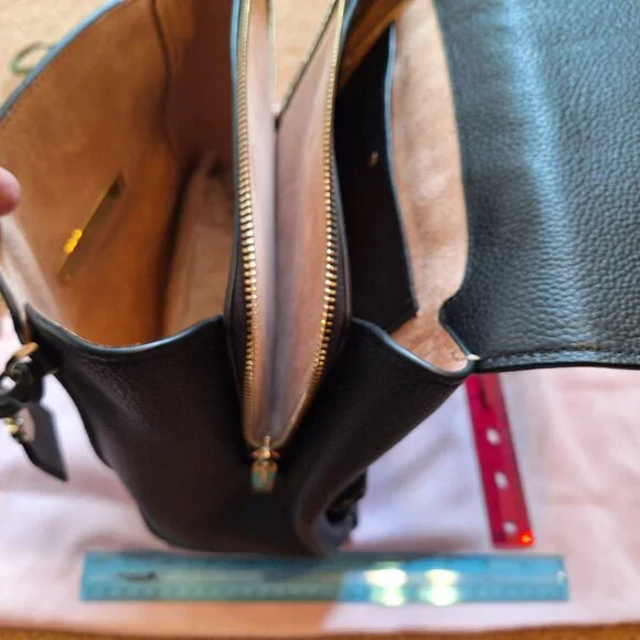 Kate Spade black pebble leather back pack.10" wide x 12" high x 4.5" deep at bottom.Has a slight taper toward top of bag.Pocket on back in full length of bag.3 inside compartments. Tan interior.Never used.Larger in size.