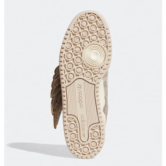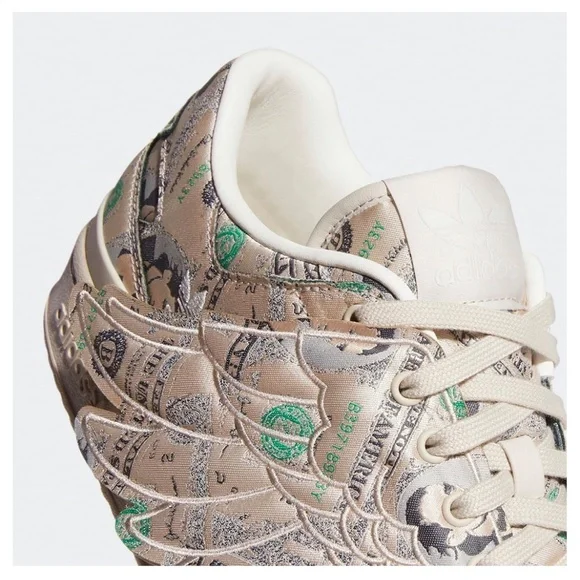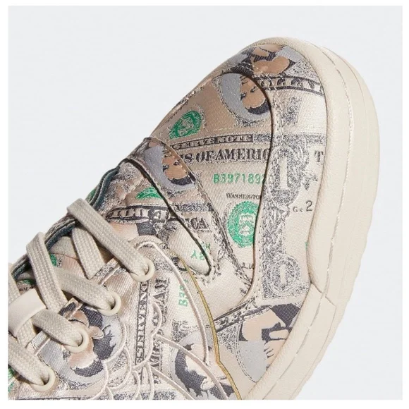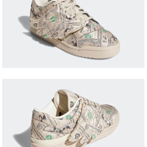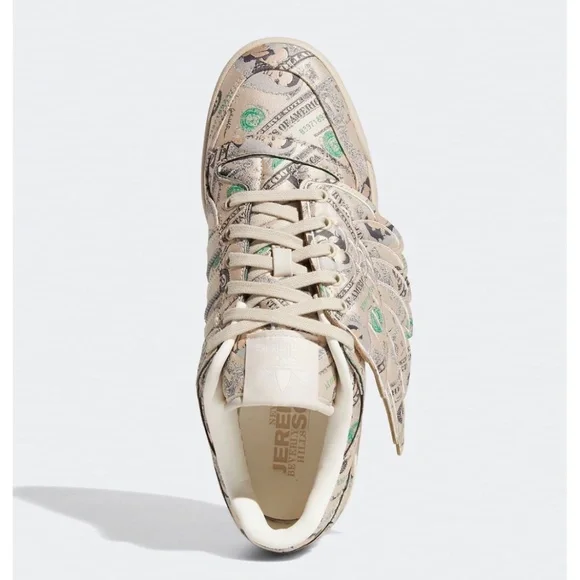 NEW! Adidas Limited edition Money Print low wings by Jeremy Scott.Fully decorated with currency print. Leather interior with branded insoles and beige laces. 3 leather stripes beige color aligning with midsole and branding. Jeremy scoot´s signature is located at the edge of the heel on the opposite side of the adidas branding. No box.