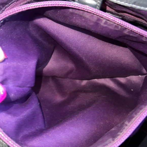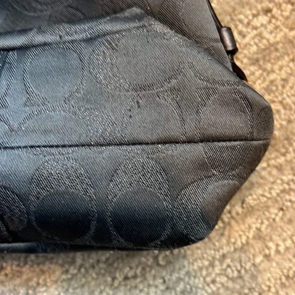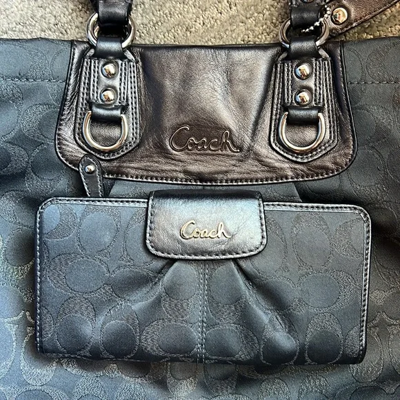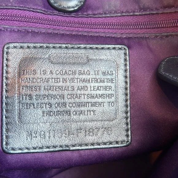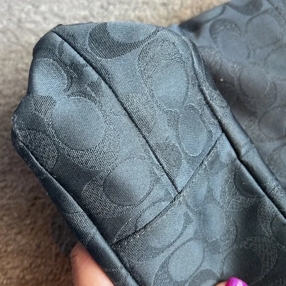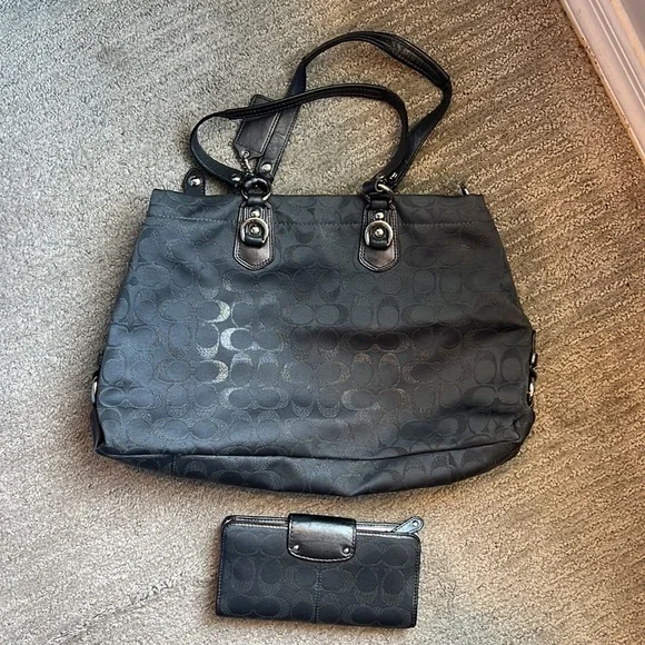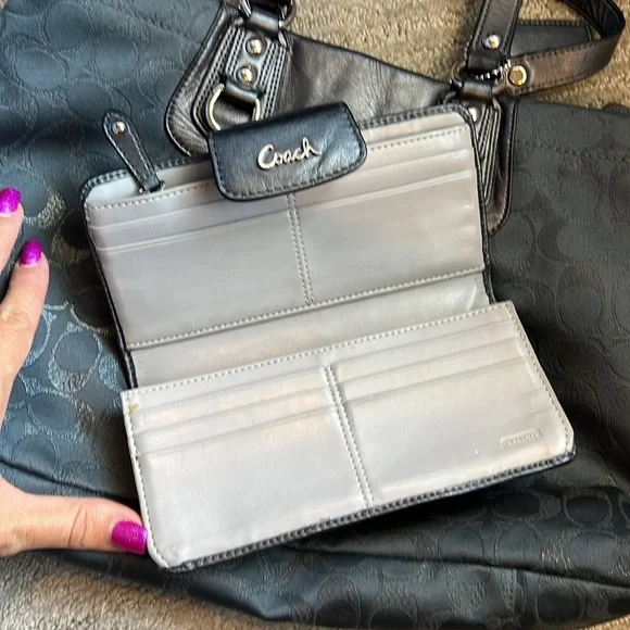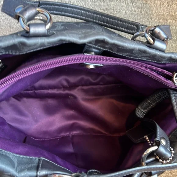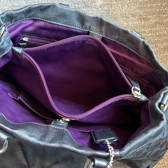 Coach brand bag, three compartments middle zipper, purple lining. Matching wallet also in excellent used condition see pictures for details. Fabric is dark gray charcoal color with a shimmer. Beautiful peace. Comes from pet free, smoke free home