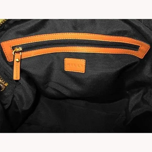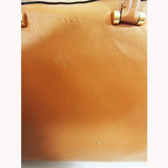 Brand: MillyColor: CaramelDimensions: 14"L x 10" H x 6.5" DDual handle straps with 5" dropLongstrap with 20" dropExterior: Made of genuine Papaya Leather exteriorDome shape with zip closureGold toned hardwareCircle grommets and studs detail frontInterior: Black sateen lining interior1 zip pocket2 slip open pocketMilly patch signatureThis Bag has beenpre-owned. It hassome minor scratchesand signs of wear onthe exterior leatherdue to being used.This bag is in great conditionsconsidering that itwas pre-owned. itdoes NOT have anyrips, tears, etc. Itcomes with PRICE TAG FROM MANUFACTURER.