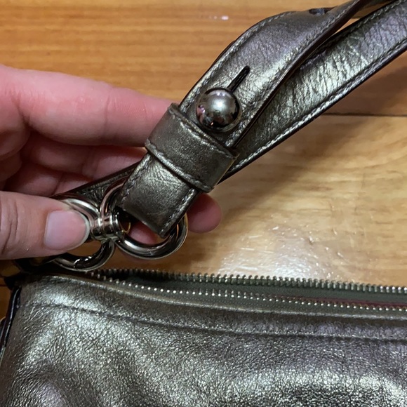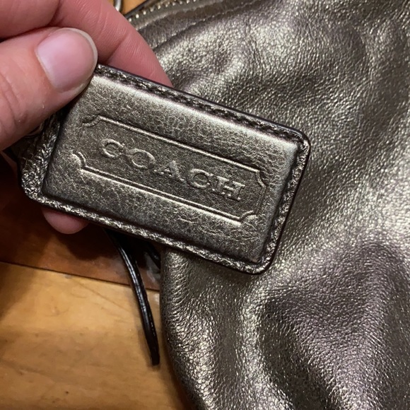 Authentic leather Coach purse in beautiful pewter color. Satin plum inside. Some minor wear and tear that can be seen in the photos, but overall great condition. Adjustable strap and authentic Coach logo inside and outside. 13 inches wide and 9 inches tall.