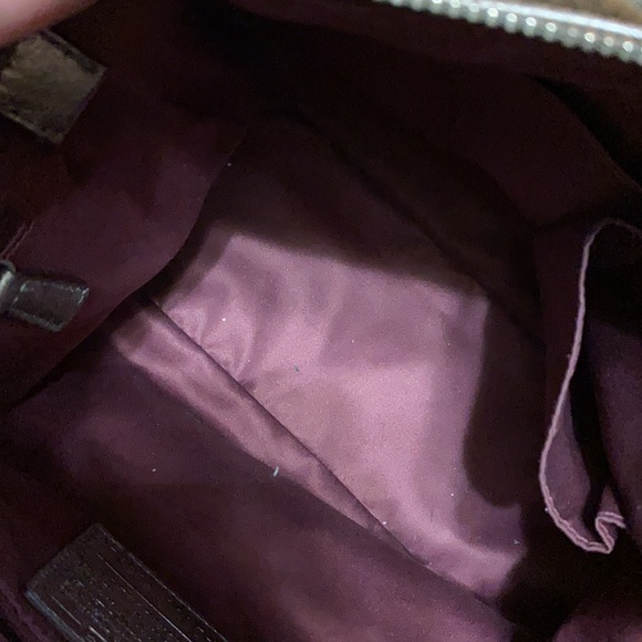 Authentic leather Coach purse in beautiful pewter color. Satin plum inside. Some minor wear and tear that can be seen in the photos, but overall great condition. Adjustable strap...