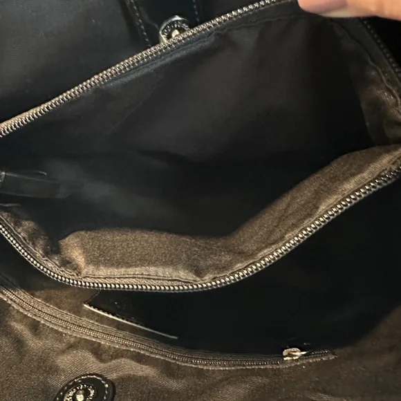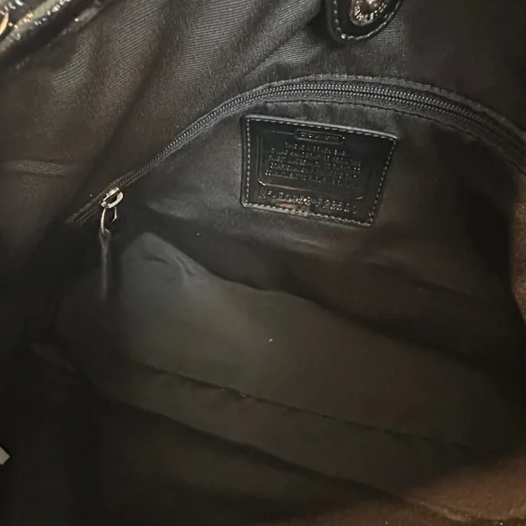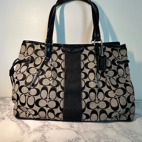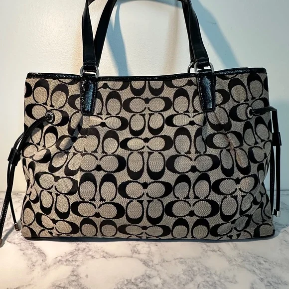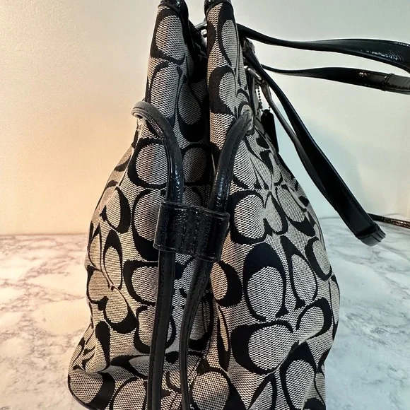 Like new, GREAT condition!No blemishes, stains, scratches.Coach canvas monogram tote with black "C" on gray background, patent leather trim.Magnetic closures from both sides to...