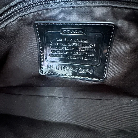 Like new, GREAT condition!No blemishes, stains, scratches.Coach canvas monogram tote with black "C" on gray background, patent leather trim.Magnetic closures from both sides to zippered center interior pocket.One zippered interior pocket on outer wall with two slip pockets on opposite outer wall.Metal feet on bottom (silver).Size:9.5"l x 14.25"w x 6" dDrop length:7.5"Matching wallet wristlet - same materials and pattern.Extra pocket on front, several interior slots for cash and cards with space for gloss and small essentials.Size:8"l x 4"w x 1"d