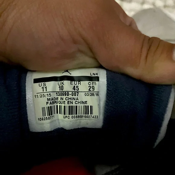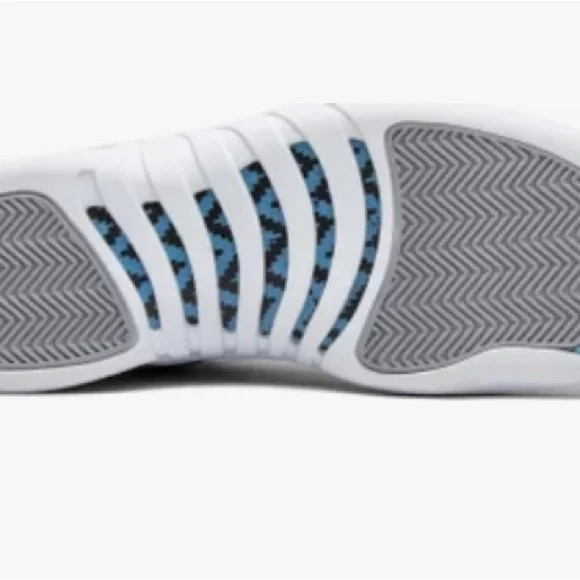 U.S size 11,Air Jordan 12 Retro, Grey/University Blue-White. The Jordan Retro 12 Grey University Blue is made from leather. Its upper part is made of grey tumbled leather. It features a Jordan Jumpman logo on its heel. Its outsole is made of rubber and it’s white in color. It also has a black "23" insignia on its heel and a blue heel stabilizer written Jumpman. Its shoe laces are grey with a blue Jumpman at the tongue. The Air Jordan Retro 12 Grey University Blue was released on June 25, 2016 at the recommended retail price of about $190.