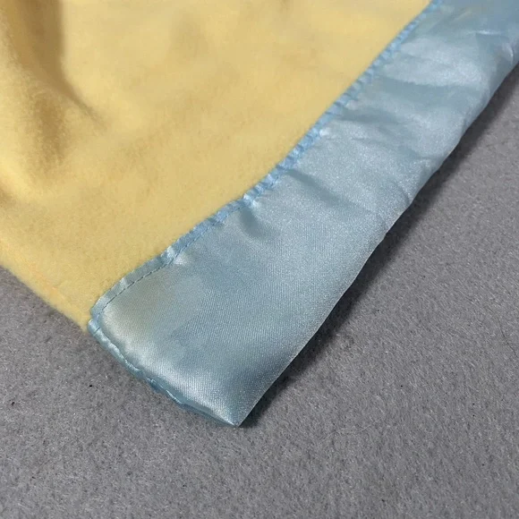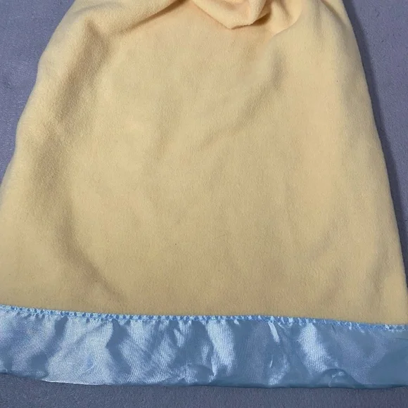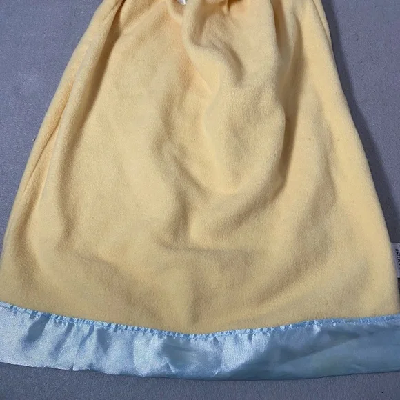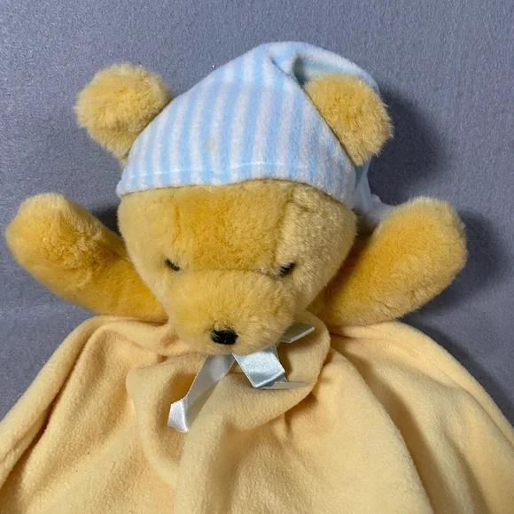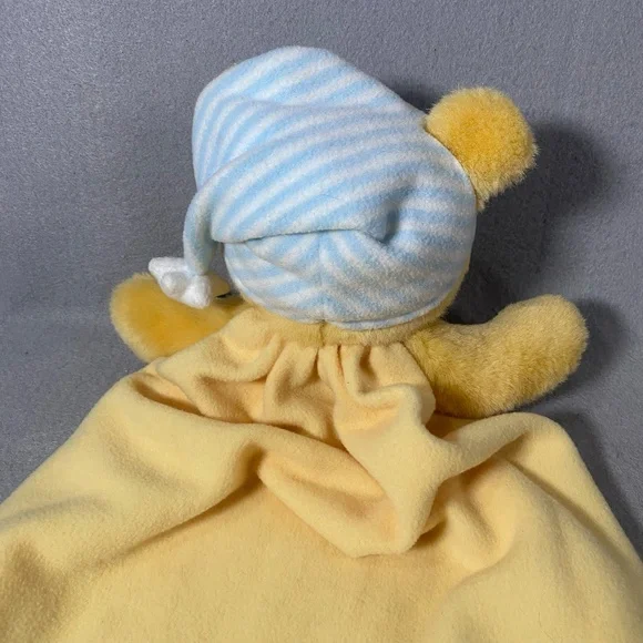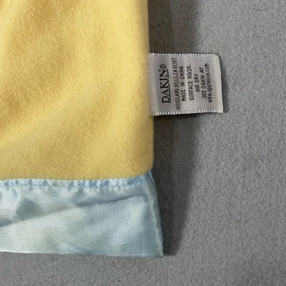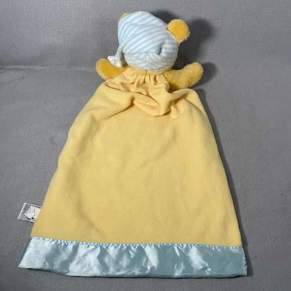 Vintage Dakin Teddy Bear Yellow Blue Security Satin Trim Blanket Baby LoveyGood preowned condition. Has some light wear from age and use including small discolored spots on head and bottom trim. See photos for details.