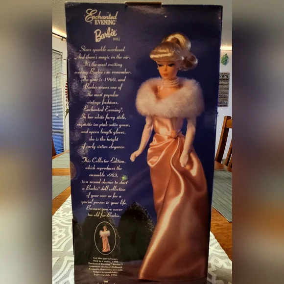 pink satin dress with white fo shallblonde hair with bangs and blue eyesblue box