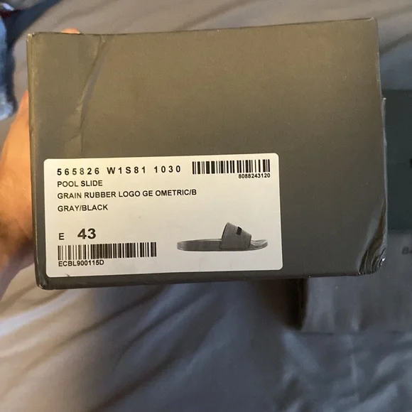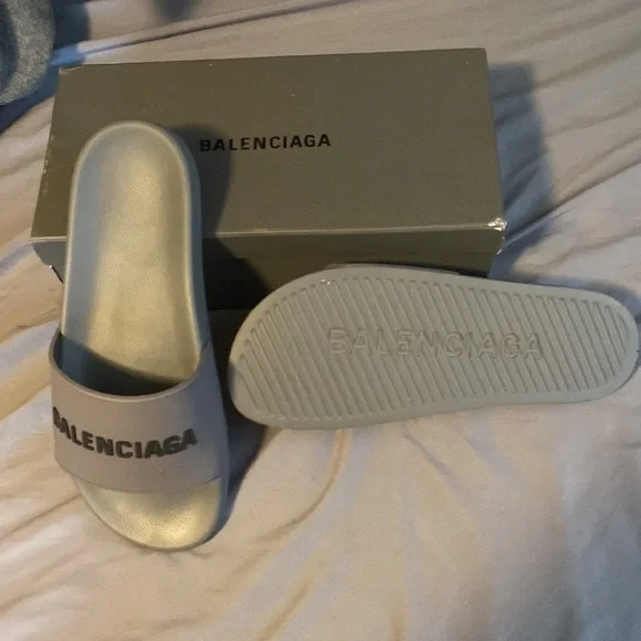 Brand new Gray and Black Balenciaga pool slides in original box with dust cover. 100% authentic and never been worn size EU 43 or US 10. Fits a little big that’s why I’m selling because they fit loose.