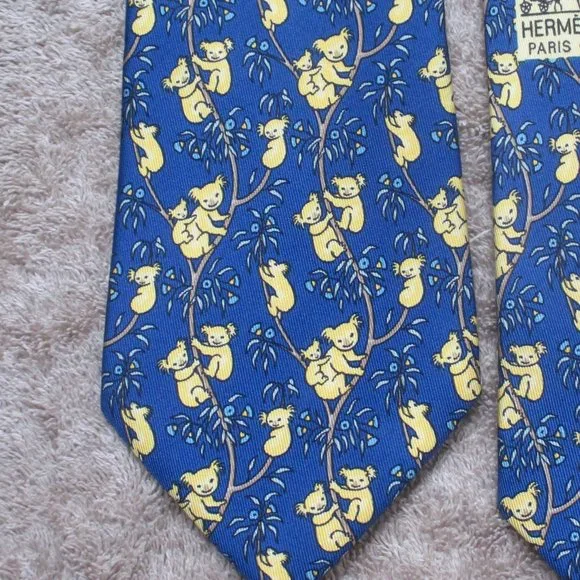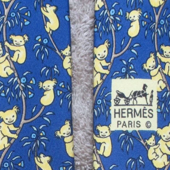 Color & Pattern:100% REAL HERMES TIE ~ LIGHT BLUE w PLAYFUL KOALA BEAR FAMILY IN EUCALYPTUS TREESWidth: 3.45 inches at the widestLength: 58 inches longSerial number: 7597...