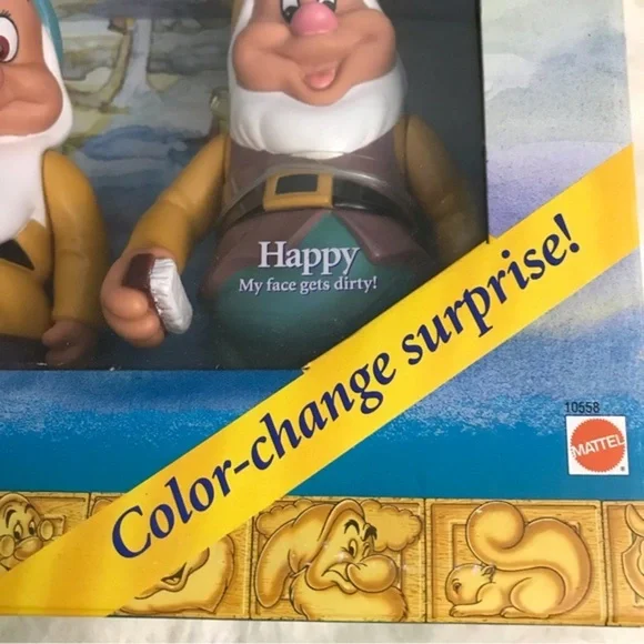 New and unopened. Some of the plastic figures have been jostled inside the box but all are perfect.Dwarves are approx 6” tall, Snow White is 12”.Add warm or cold water and the dwarves develop a surprise on their faces!
