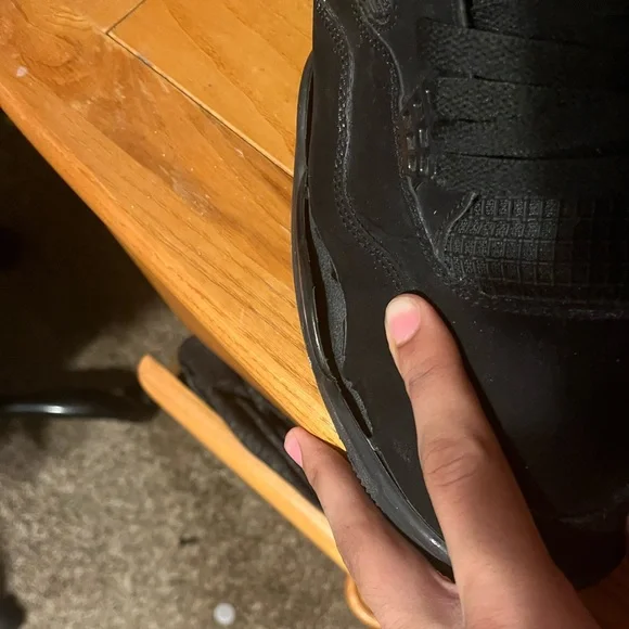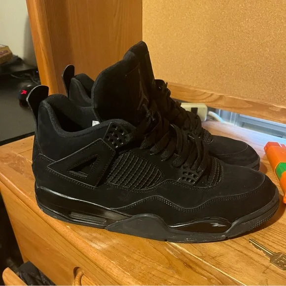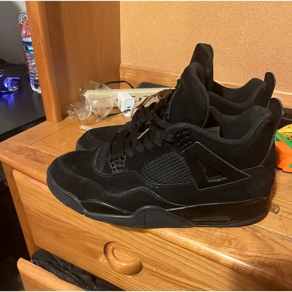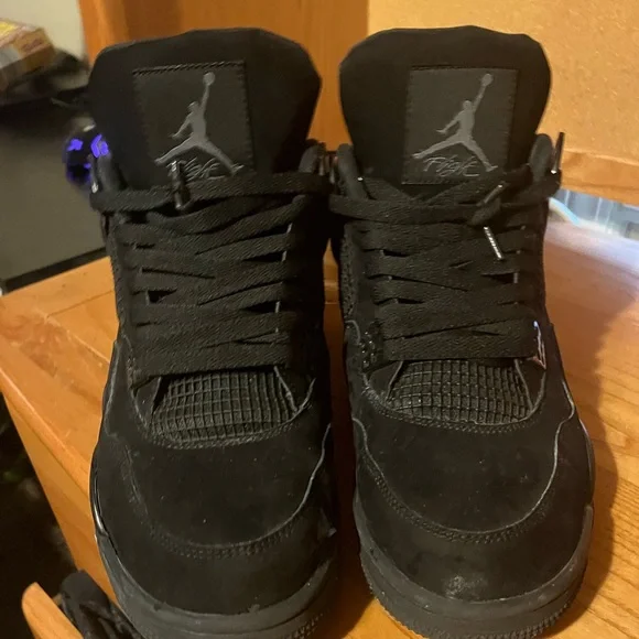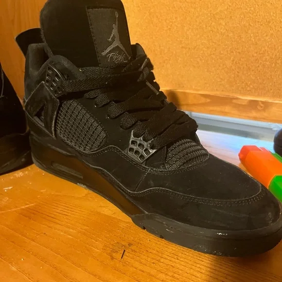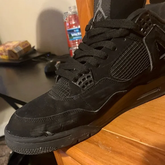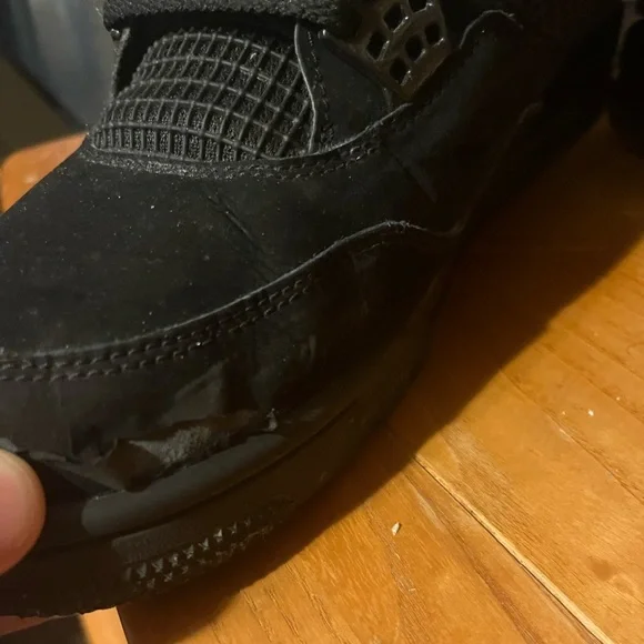 black cat jordan 4 beat a little inside of right shoe is ripped