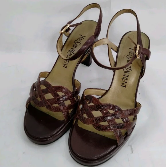 Elevate your style with these Yves Saint Laurent brown heels, featuring a sophisticated open-toe design and secure ankle straps. Crafted from premium leather, these heels offer a polished finish and a comfortable medium-height heel, perfect for any formal occasion.