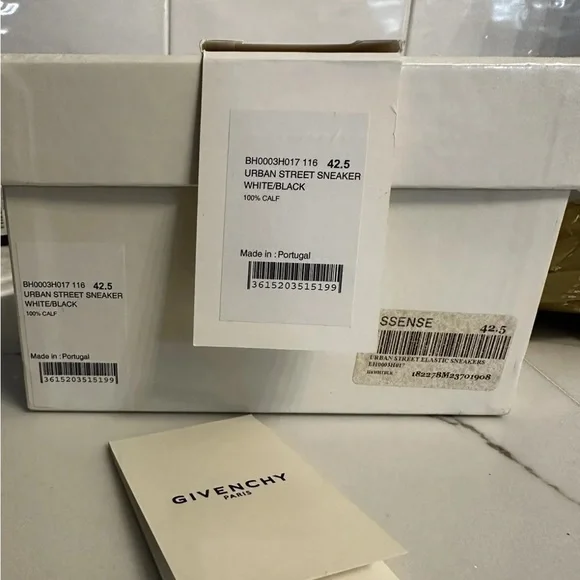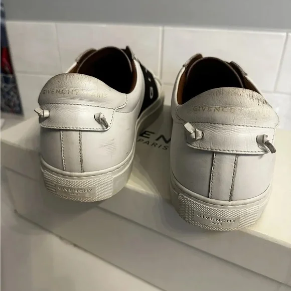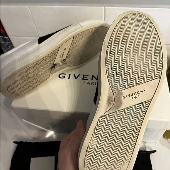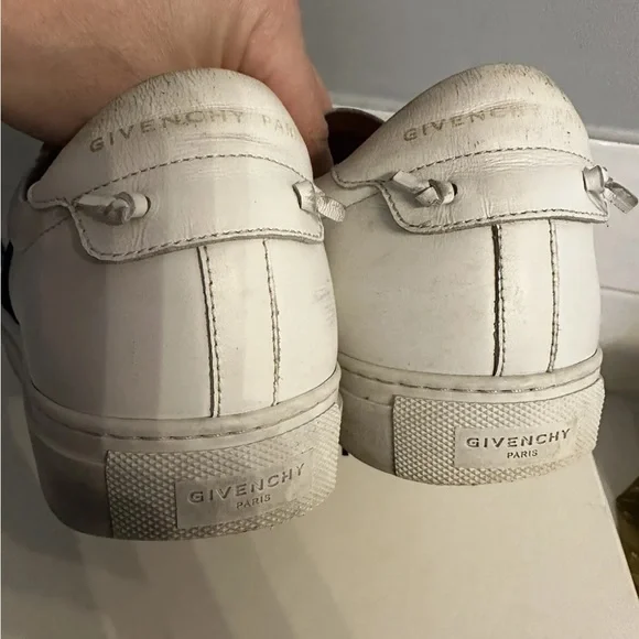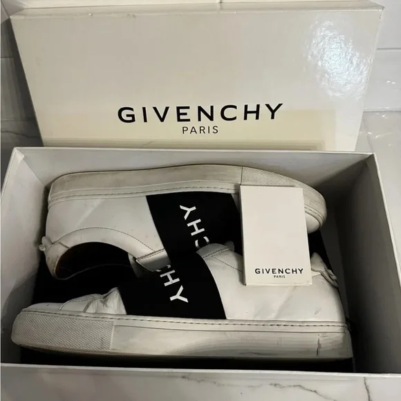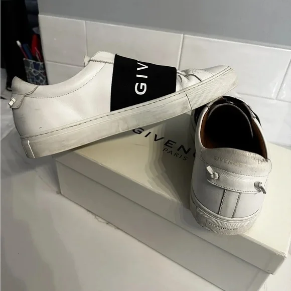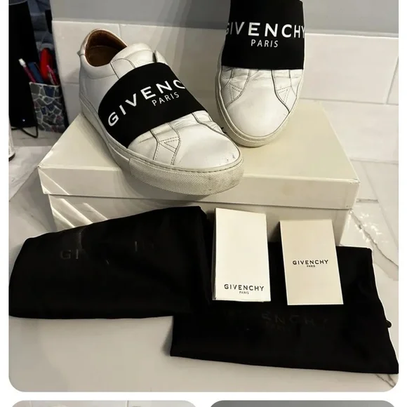 Givenchy slip on white calf skin with elastic logo band. These are model: urban street sneakers.Very good condition the bottoms are a little dirty see pics. These are Italy / EU 42.5 which the conversion is a US 9.5. Fits large.Has silver logo on back with leather tie knots. Insides are excellent. I took really good care of these. Comes with box, 2 logo bags and authentication card. I purchased these from SSENSE.com for $695.Please ask me any questions