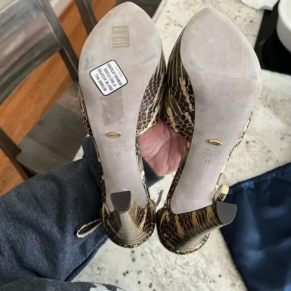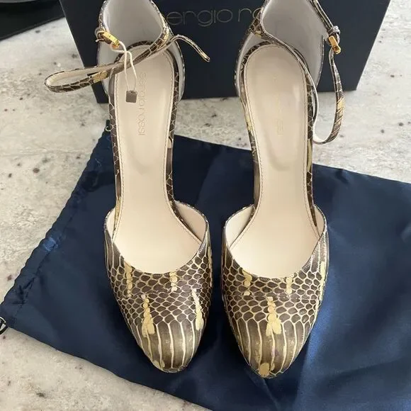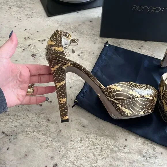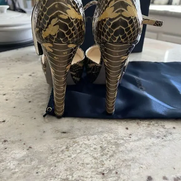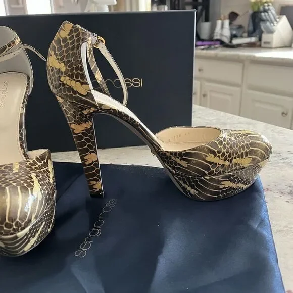 Sergio Rossi Brown & Cream Snake Patent Leather Platform Heel sz 41 or 10-1/2