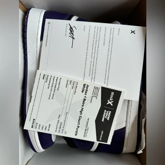 Jordan 1 Retro High Court Purple WhiteUS Men’s 8.5US Women’s 10Worn twice Great Condition StockX approved Current price on StockX is$166Paid $323 Willing to negotiate