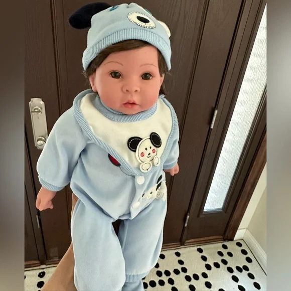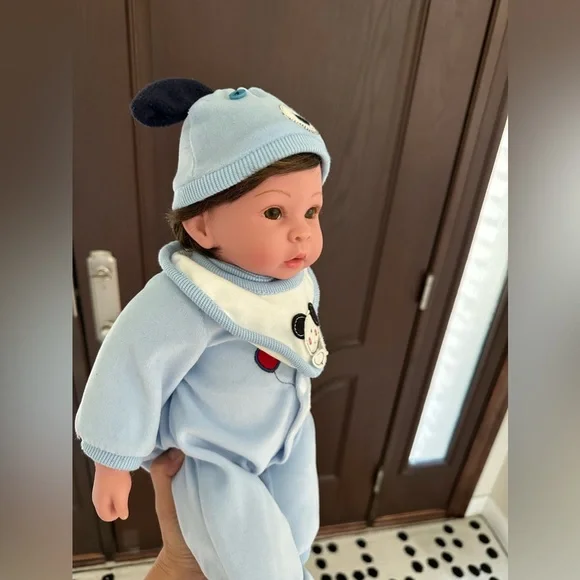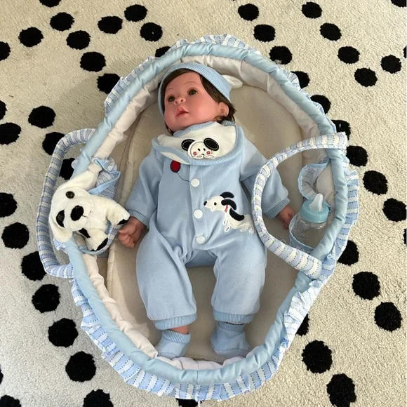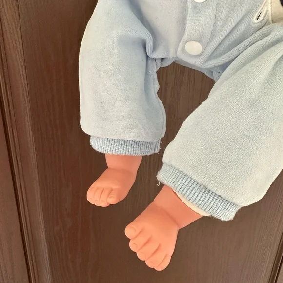 include:hat, bib, socks, bottle, basket and baby’s pet.There is wear and tear on the pacifier and there are stains on the back of the baby´s clothes. The baby clothes,...