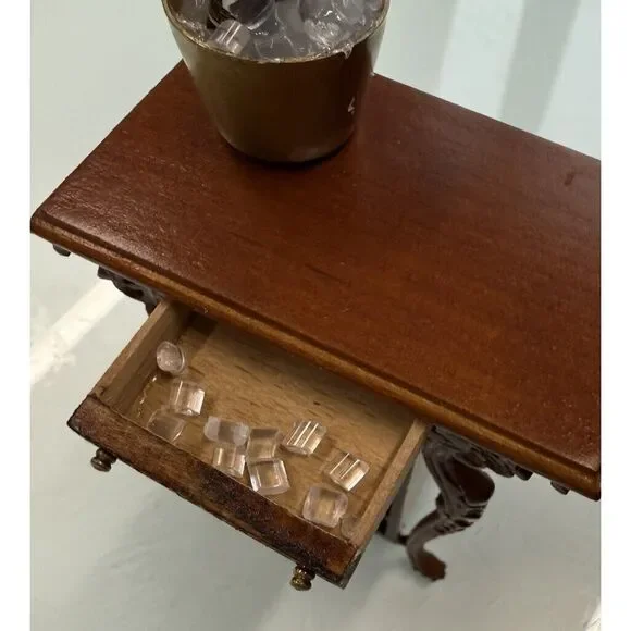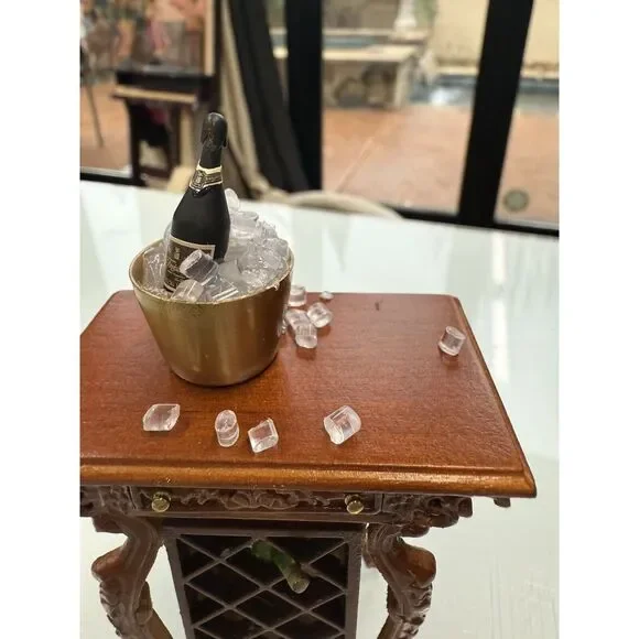 Authentic Bespaq wine rack including champagne bucket and tiny ice cubes. Also extra wine bottles New.This is a Bespaq dollhouse miniature set that includes a fantasy lyre bar, wine rack, and accessories. The set is designed for dollhouse enthusiasts who want to add a unique and decorative touch to their miniature collection. The fantasy lyre bar adds a whimsical element to the dollhouse setting, while the wine rack and accessories provide realistic details for a sophisticated display.