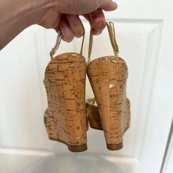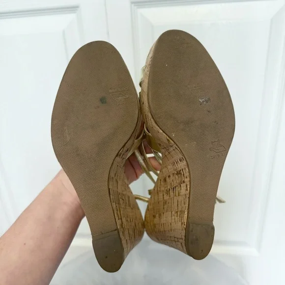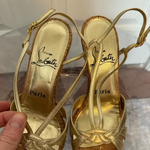 Christian Louboutin Gold Leather Strappy Cork Wedges - US7 IT37 Wear is as shown, great condition. Cats Paw rubber soles.