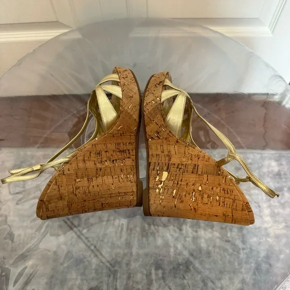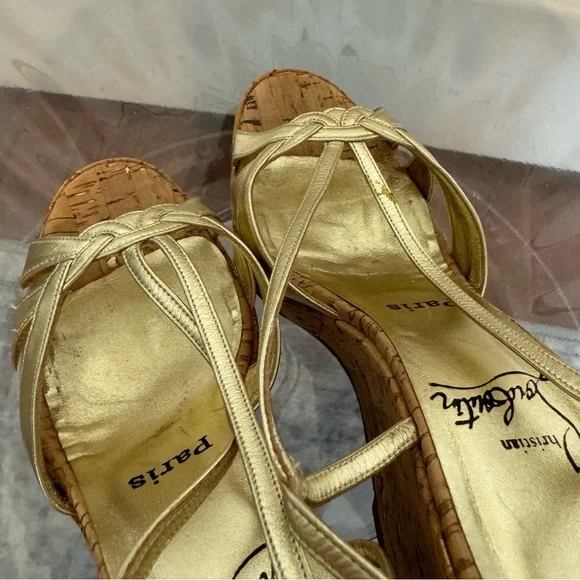 Christian Louboutin Gold Leather Strappy Cork Wedges - US7 IT37