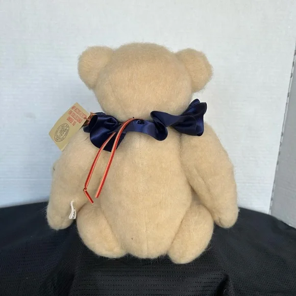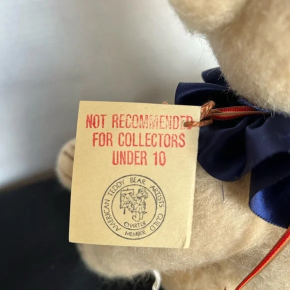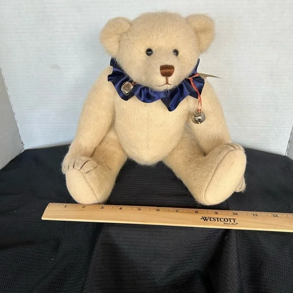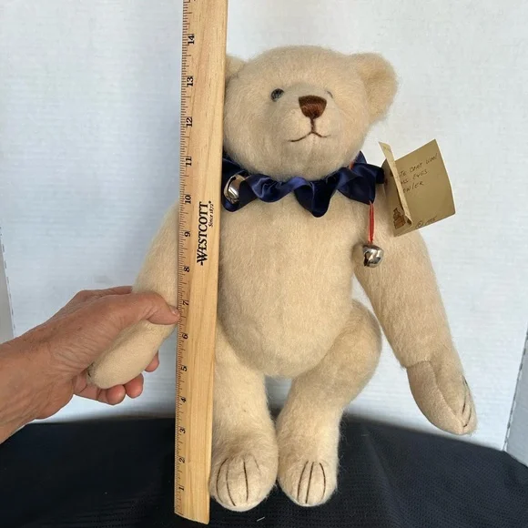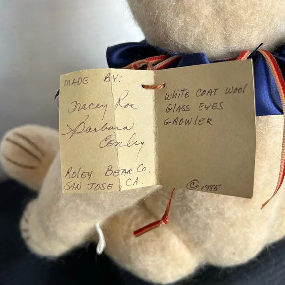 This adorable cream-colored stuffed bear features a charming blue collar with bells. Handmade by artist Barbara Conley in 1985. Original tag has notes from artist. Member of American Teddy Bear Artists Guild. Approximate height is 13 inches. Excellent condition.