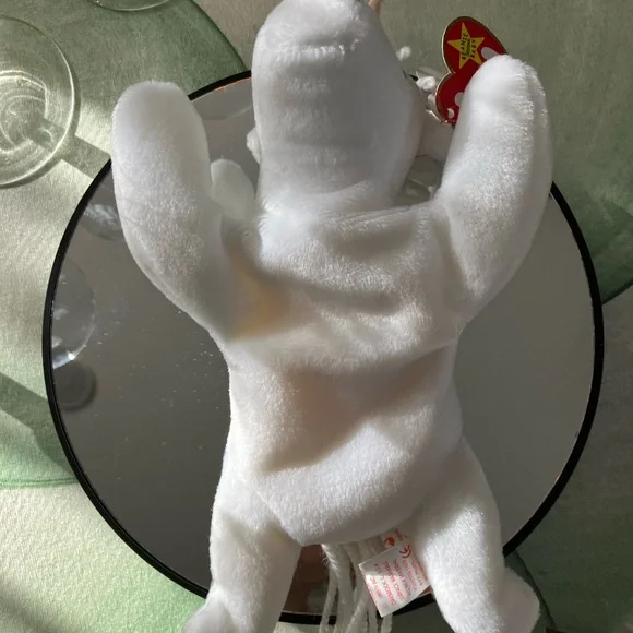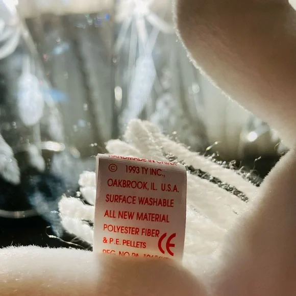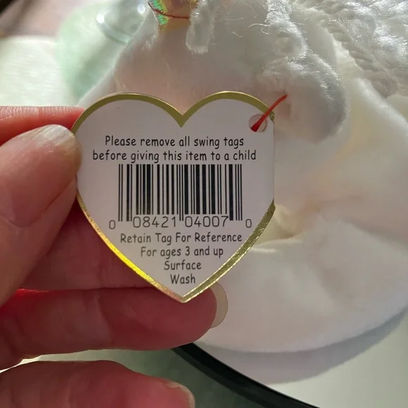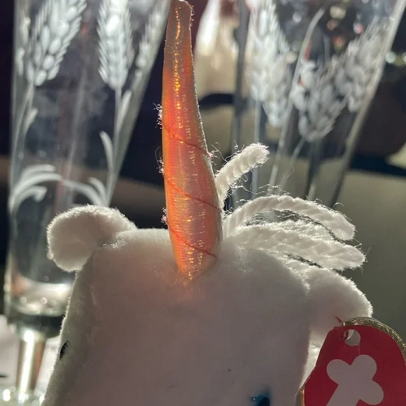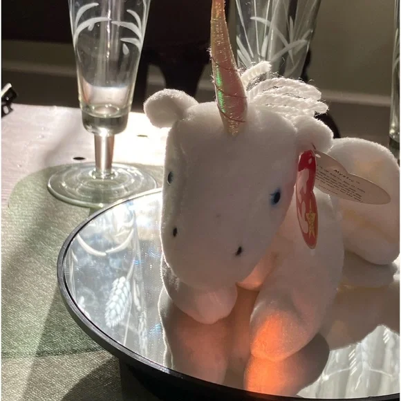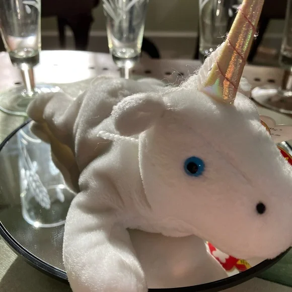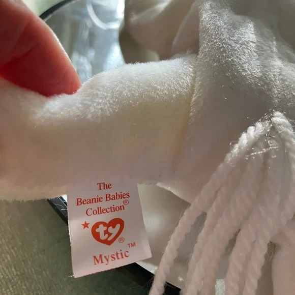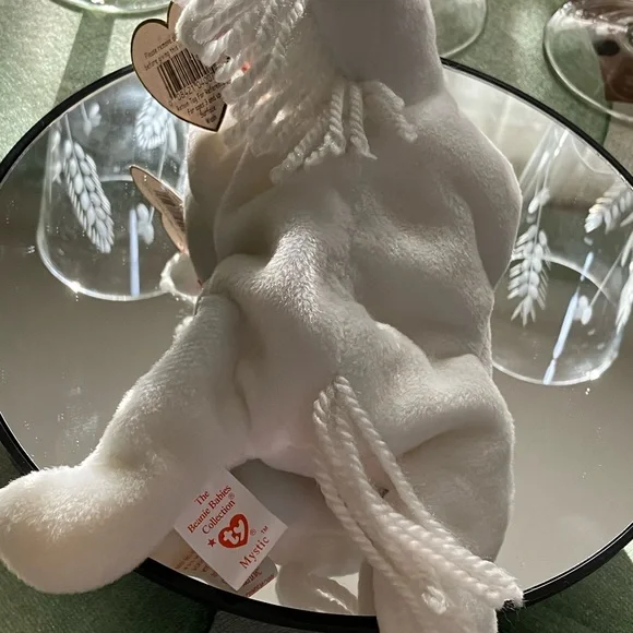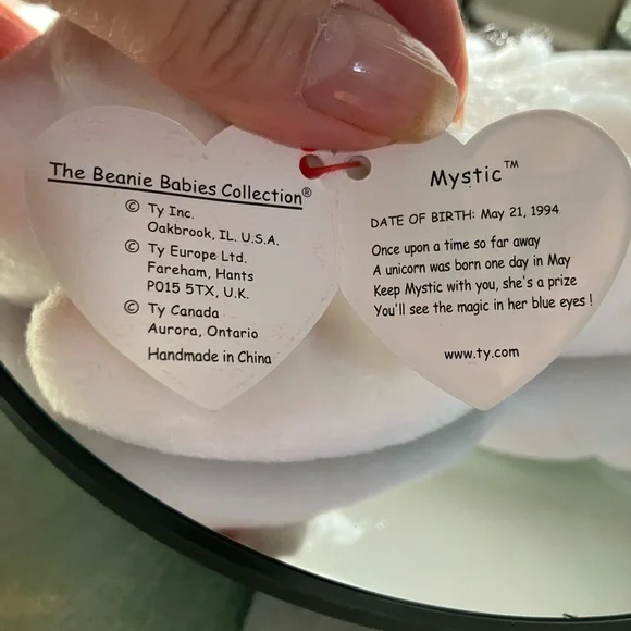 Mystic, the beanie babies collection, Ty unicorn -BEANIE BABY - date of birth May 21, 1994. Herpoem reads:”once upon a time so far away- a unicorn was born one day in May. Keep Mystic with you she’s a prize -you’ll see the magic in her blue eyes. Vintage copyright 1993 Ty Beanie Babies Collection Mystic the unicorn style 4007- 4th generation tush and hang tag . Tush tagdate 1993 Mystic is a white girl unicorn , as the poem states “ she’s a prize “ with blue and black button, eyes and black stitching for her nostrils. She has a shiny iridescent horn with pink stitching and white yarn for her maneand tail. . She was first introduced on June 25, 1994