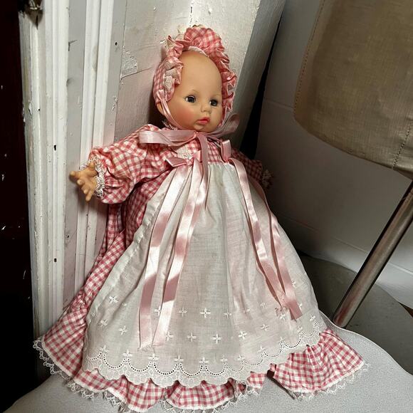 Doll cries with movement! Eyes open and shut. Fading and mark on dress see pic. Small mark on bonnet see pic. Back of doll has some yellowing pictures and video! No odor on dress or doll! Year looks like 1975 or 1978
