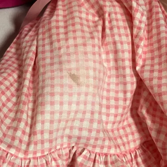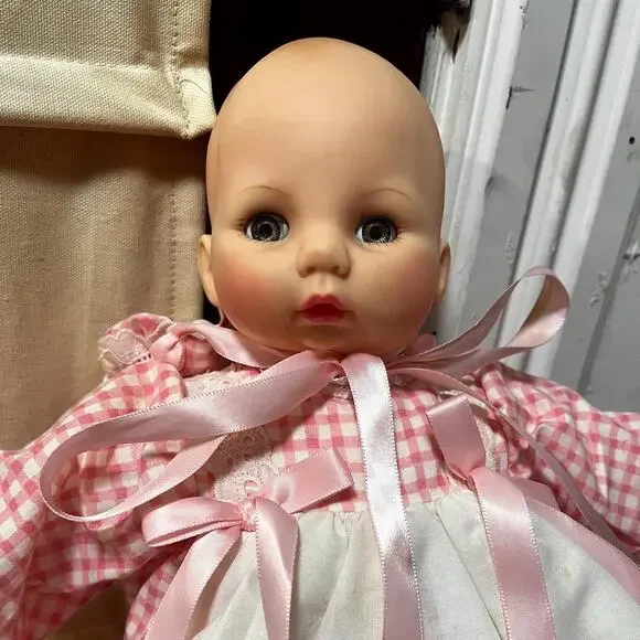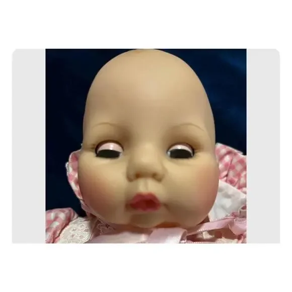 Doll cries with movement! Eyes open and shut. Fading and mark on dress see pic. Small mark on bonnet see pic. Back of doll has some yellowing pictures and video! No odor on dress...