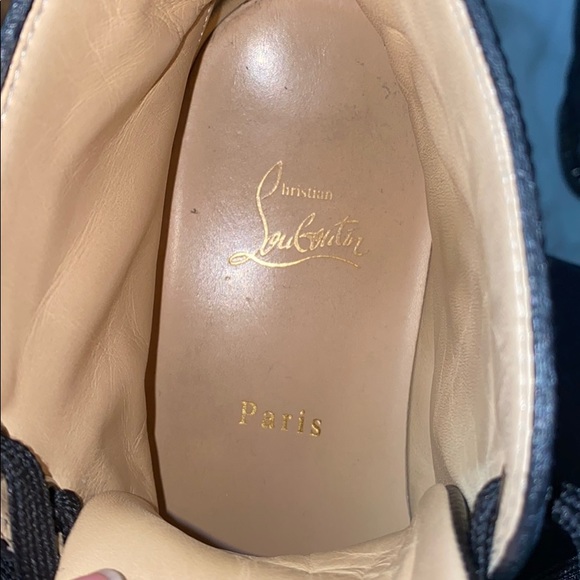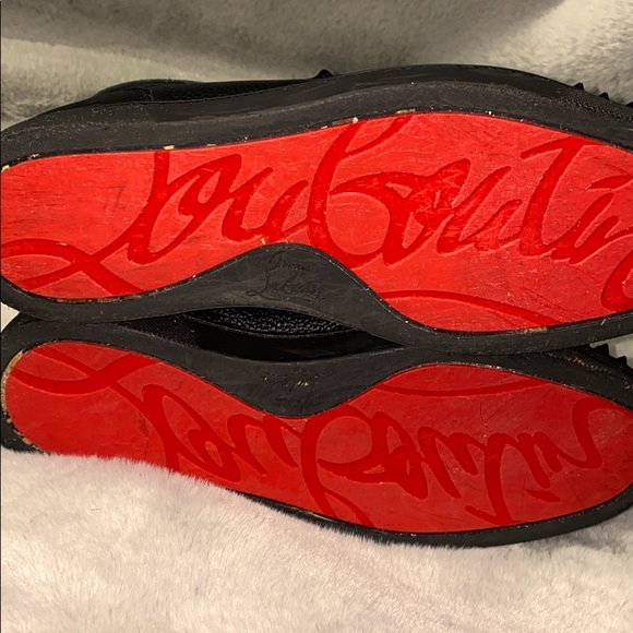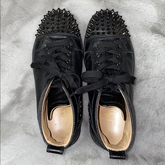 CHRISTIAN LOUBOUTINLOU SPIKES FLATHIGH TOPSBLACK CALFSKIN LEATHERICONIC BLACK SPIKES ACROSS TOEBOLD STATEMENT SHOESRED BOTTOM SOLEEXCELLENT CONDITIONNO BOXNO DUSTBAG