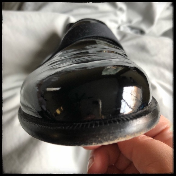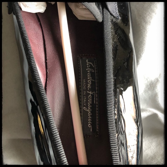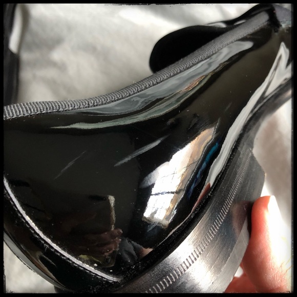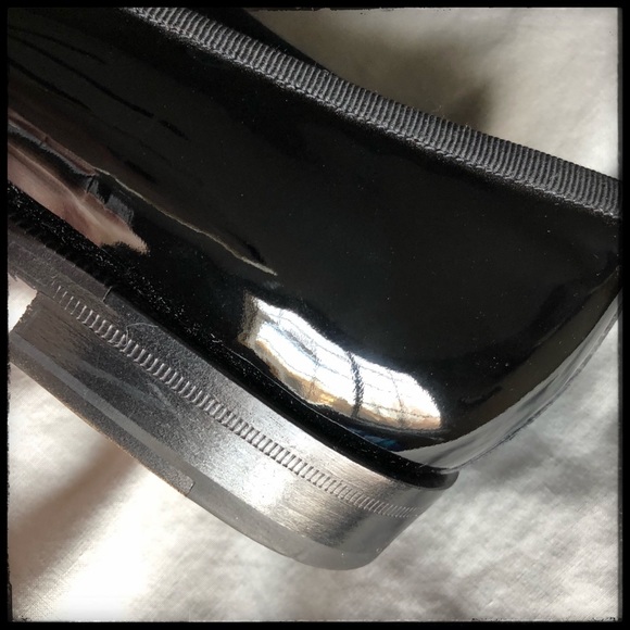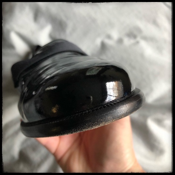 This is an elegant dress shoe! Full patent leather slip on smoking slippers with a grossgrain ribbon strap across instep. Made in Italy, these shoes are leather lined with a rubber sole. Worn once. They’re in excellent condition with very light marks on inside of heels. No box, but they’ve been thoughtfully stored inside dust bags. Non-smoking home. Ideal for wedding, engagement party, black tie.
