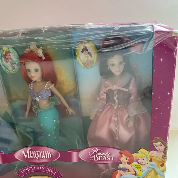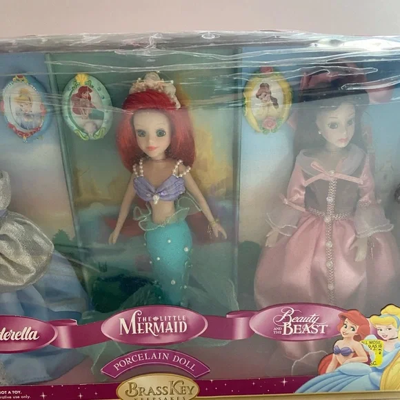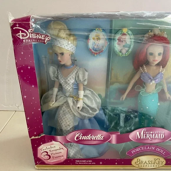 NOTE: New in Box - box is damaged - dolls have never been removed from box - dolls are in original packaging Cinderella The Little MermaidBeauty abd the BeastPorcelain DollSet of 3includes 3 keepsake picture framesBrass Key Keepsake2024