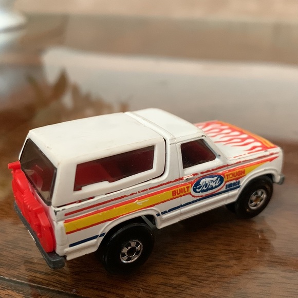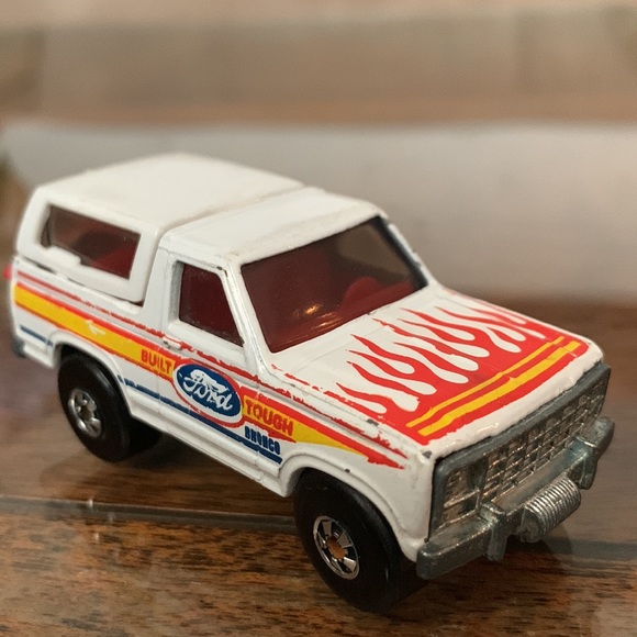 As pictured1980 vintage Ford Bronco by Hot wheelsWhite coolred flames on hoodred seats interior2 doorRed Motorcycle on backSee pics for details ******Truck is 43 Runs plays displays as it should. Great on gas! Original owner.Great for the collectors collection of collectible classic antique vintage htf rare kidtoys from the 80s Hotwheels hot wheelOffers welcomeAll sales final