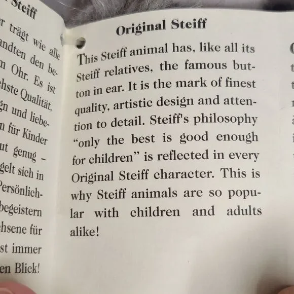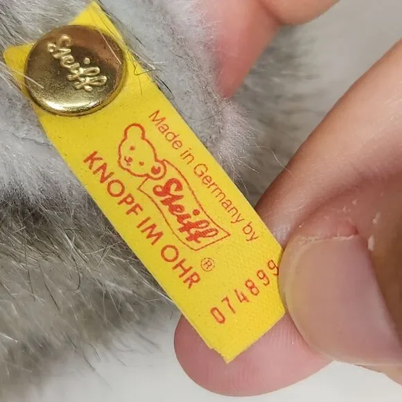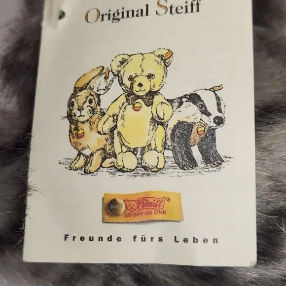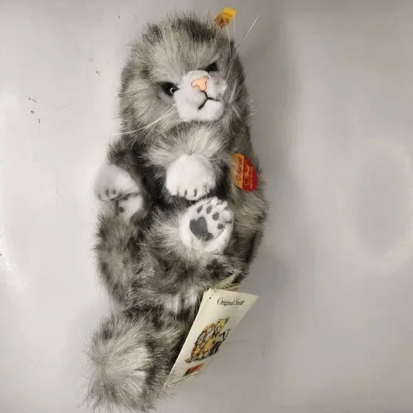 The NWT Vintage 90´s Steiff Sleeping Laying Playing Grey Tabby Cat Minka 074899 is a small stuffed animal toy measuring 10 inches. Made by the renowned brand Steiff, this adorable grey tabby cat is perfect for collectors or children who love cuddly toys. With its vintage charm and high-quality construction, this Steiff cat is sure to bring joy and nostalgia to whoever receives it.ES1894JN25