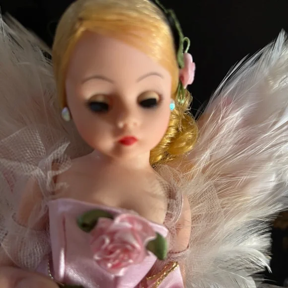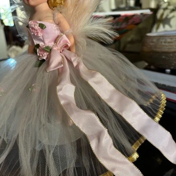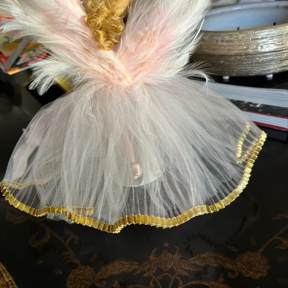She is in excellent condition, from a smoke free, pet free home. However, she has lost theheels to her shoes, viewed in one pic. Approx 9” on the stand, to the top of her head. Feathers are higher. All else can be seen from the pics. Questions welcome! Sorry I don’t have the original box.