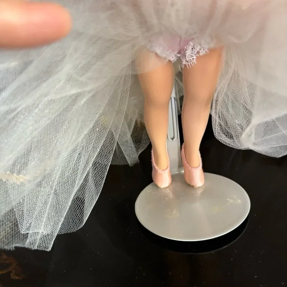 She is in excellent condition, from a smoke free, pet free home. However, she has lost theheels to her shoes, viewed in one pic. Approx 9” on the stand, to the top of her head....