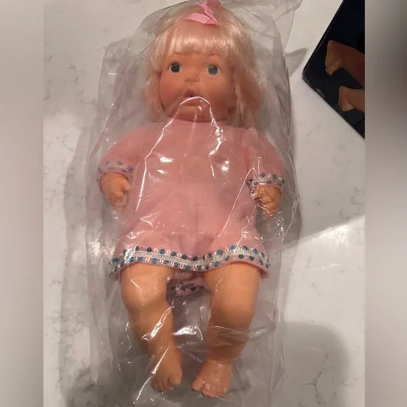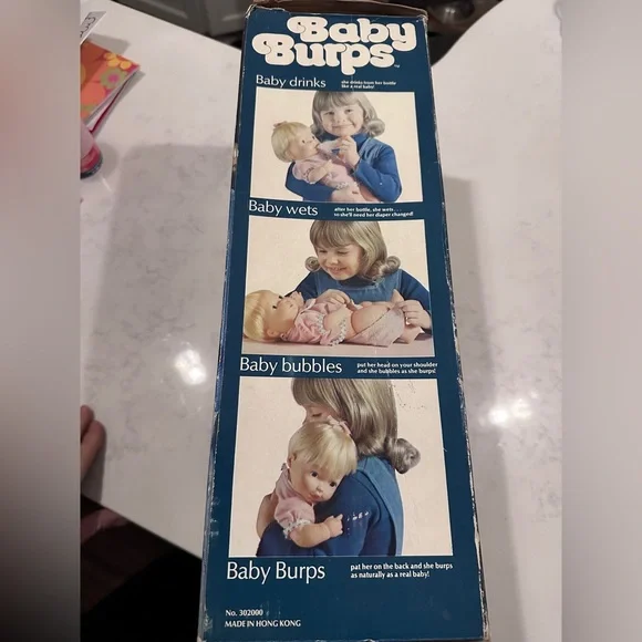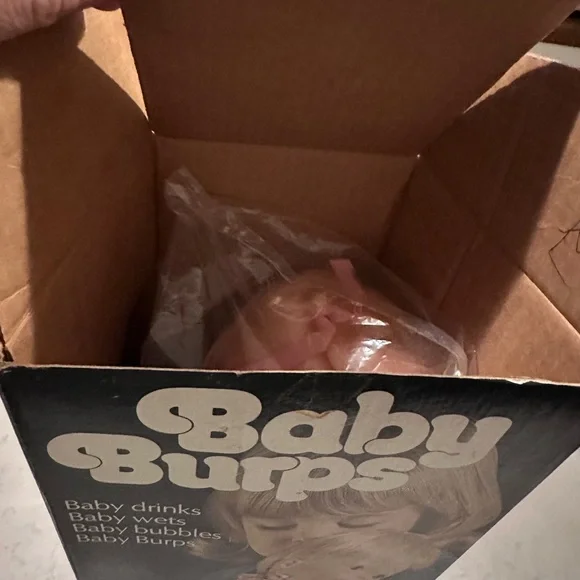 Introducing a rare and vintage 1975 Vogue baby burp doll with its original box. This collectible item is made of plastic and features a multi-color design. It was manufactured in Hong Kong and has a unique style that sets it apart from other decorative collectibles. This one-of-a-kind item is perfect for collectors and vintage enthusiasts alike. It comes with its original box and features a unit quantity of one dollar. The doll is made of high-quality plastic and has a charming design that will make it a great addition to any collection. Don´t miss out on this rare find! Comes from a smoke free & pet free home.Box has been opened No bottle or bib