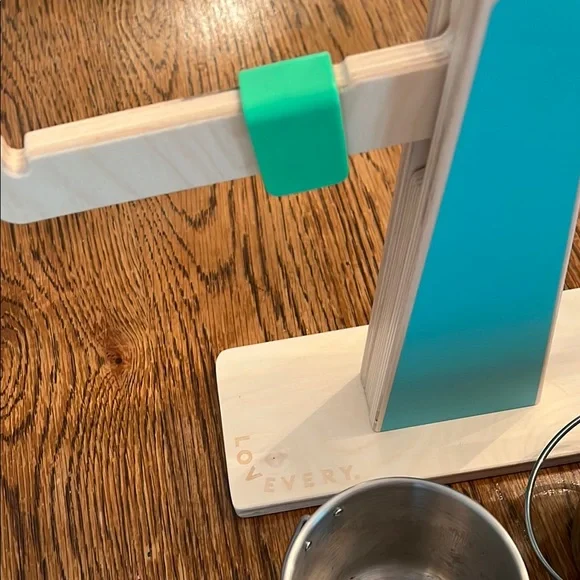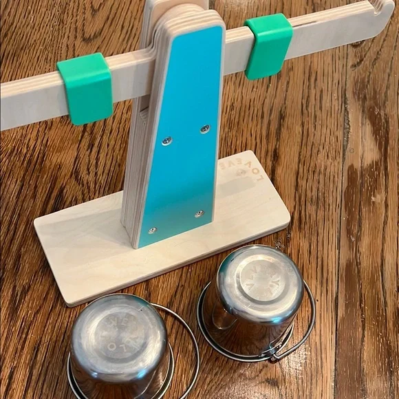 Wooden balance scale featuring a teal accent and metal bucket. Ideal for educational play. Every Which Weigh Scale & PailsThis toy helps toddlers learn about balance, measurement, and weight through hands-on playKey features include:A wooden scale with adjustable sliders for calibration. Two metal pails for filling with various objects. Encourages early STEM learning through experimentation with weight and balance. Promotes fine motor skills and grip development. Can be used for both indoor and outdoor play, such as gathering rocks, leaves, or other small items. The pails can be used to explore liquid and solid volumes. The toy is part of ´s Enthusiast Play Kit. offers a subscription service with play kits tailored to a child´s developmental stage