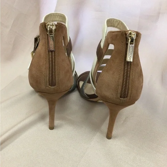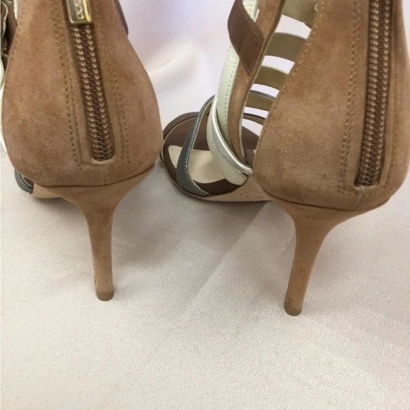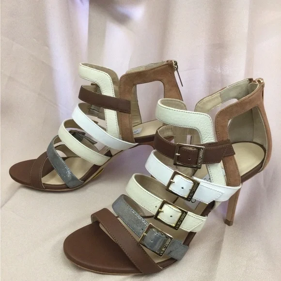 JIMMY CHOO Bubble Buckle Leathermix Sandals, Originally $925.00, Size 8 1/2, Excellent Condition, Includes Box & Dustbag, Tan Suede with Brown/White/Ivory/Silver Metallic Leather Straps, Gold Buckles & Heel Zipper, 3.5” Heel, Very Minor Flaws as Pictured