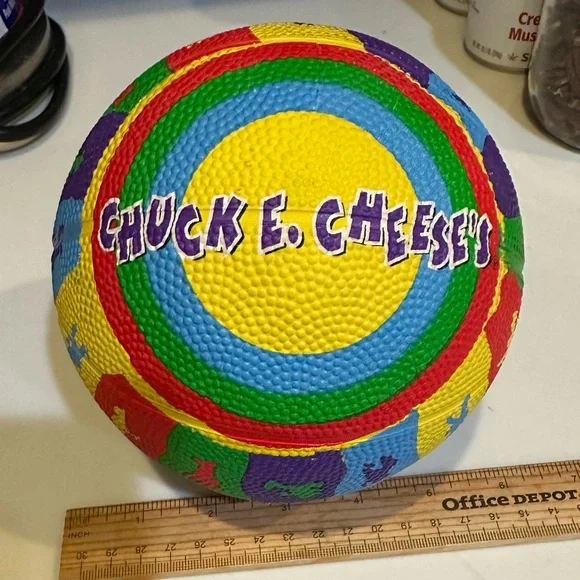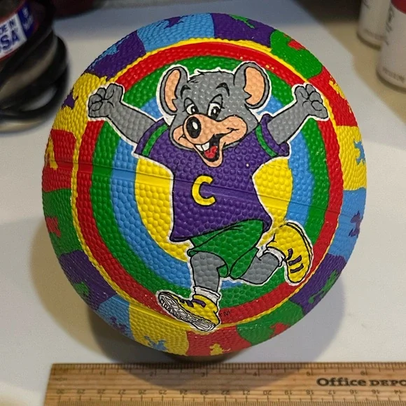 VTG Y2K SMALL 5” CHUCK E CHEESE COLORFUL BASKETBALL CHUCK E CHEESE’S COLLECTIBLE Fun and vibrant basketball featuring Chuck E. Cheese. Perfect for kids and playtime or for the Collector.SUPER CUTE!Never used.