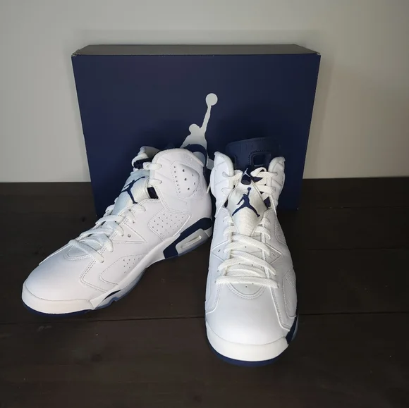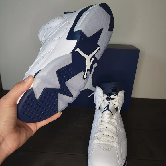 Air Jordan 6 Retro : Midnight Navy*BNIB never been worn A classic two-tone colorway initially released in 2000. The legacy silhouette sports a white leather upper with perforated detailing throught the midfoot and collar. Navy blue accents land on the signature widowed tongue, molded heel tab, and the Jumpman branding hit that decorate the lace guardand back hee. The sneaker rides on a two-tone polyurethane midsole, enhanced with a visible Air-sole heel unitand supported by a translucent rubber outsole.