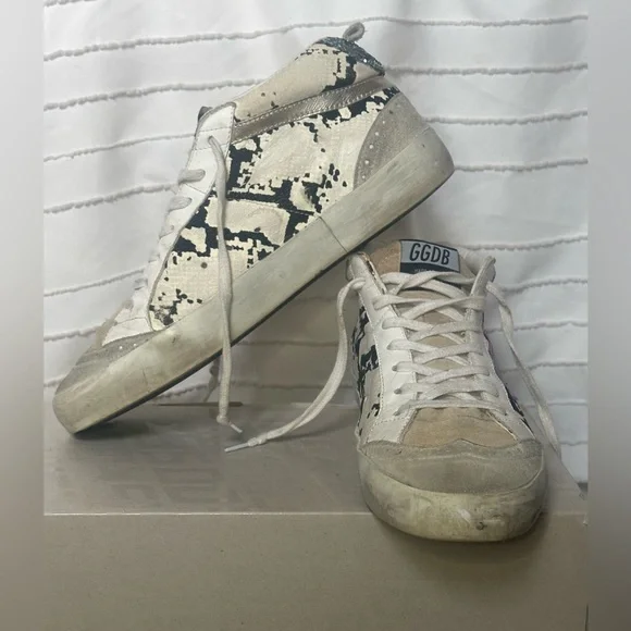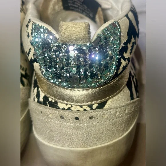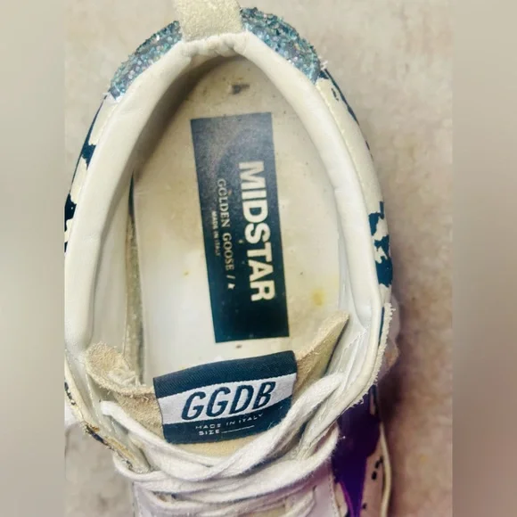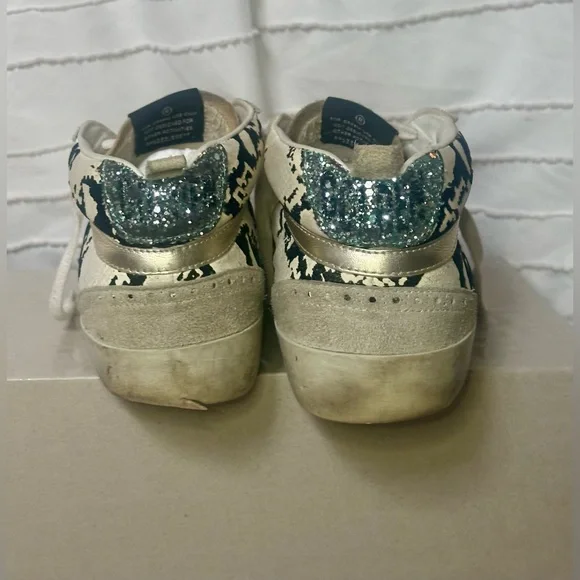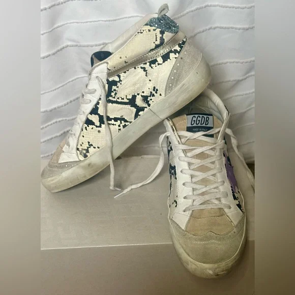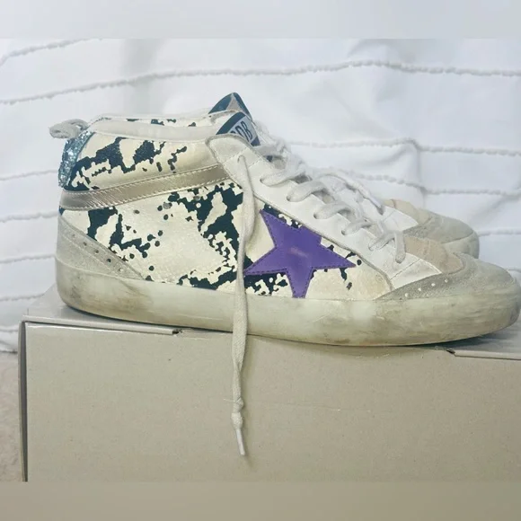 Golden Goose Mid Star Classic Sneakers. Suede Toe and Tongue, Light Grey Python Leather, Purple Leather Star and Blue/Silver Glitter. Comes with Original Box, Pamphlet and Dust Bag!!